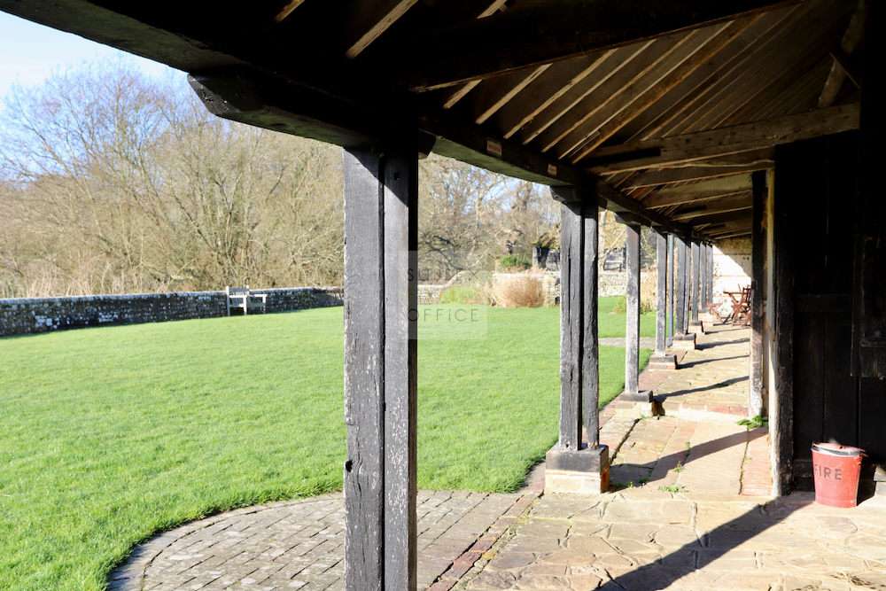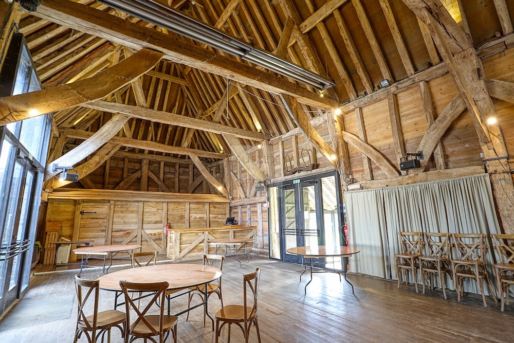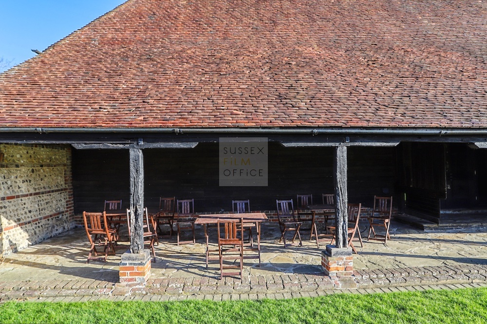 Oak beam Grade II listed 17th century Elizabethan Great Barn located on the site of an historic Tudor house and set among 7 acres of beautiful gardens and situated on an island. Features include a wooden floor, exposed beams, small upper gallery, timber frame clad with tarred weatherboards, arched queen post roof, and covered outside seating area. A stunning location for filming and photography.