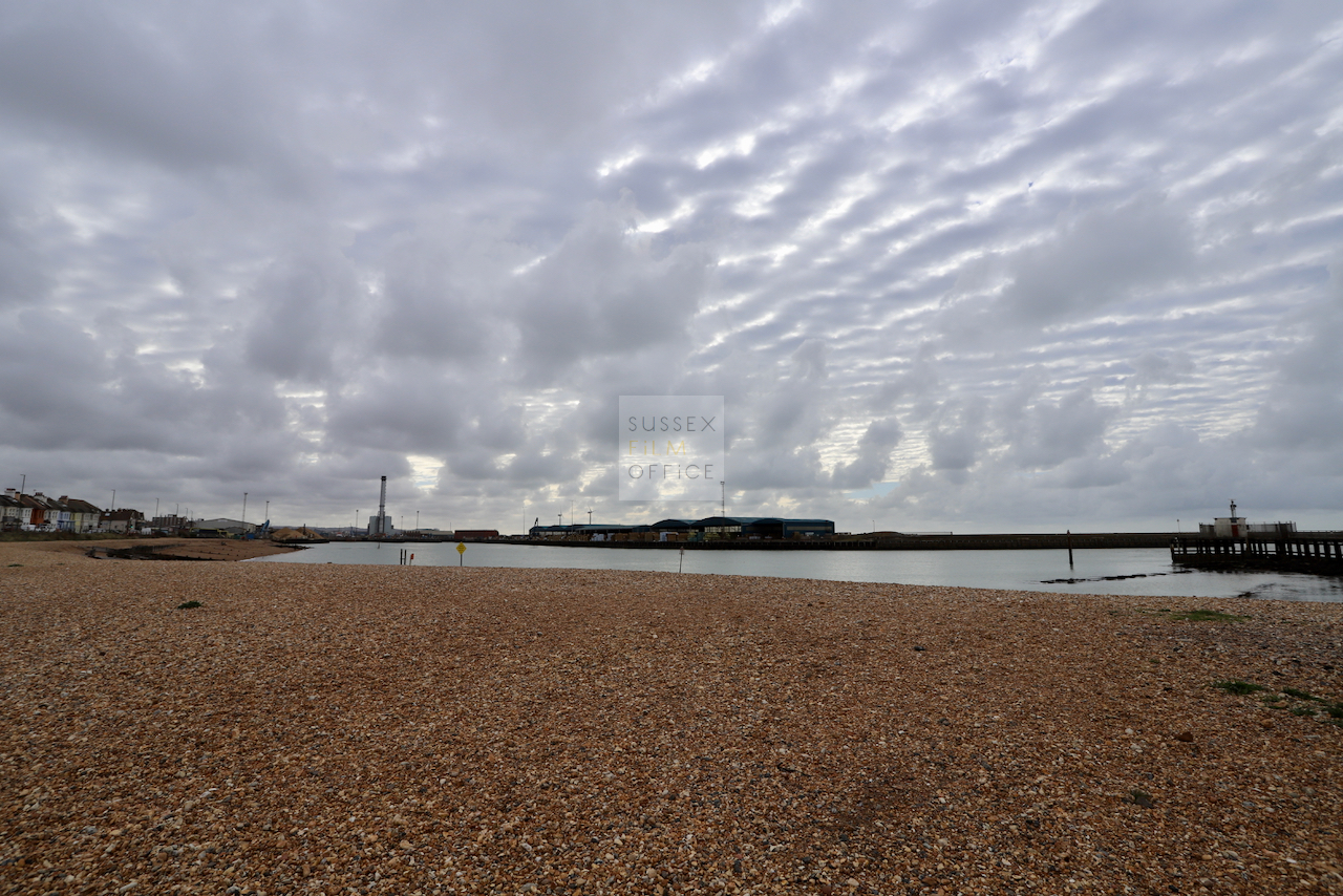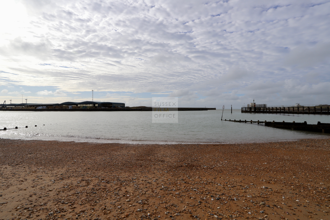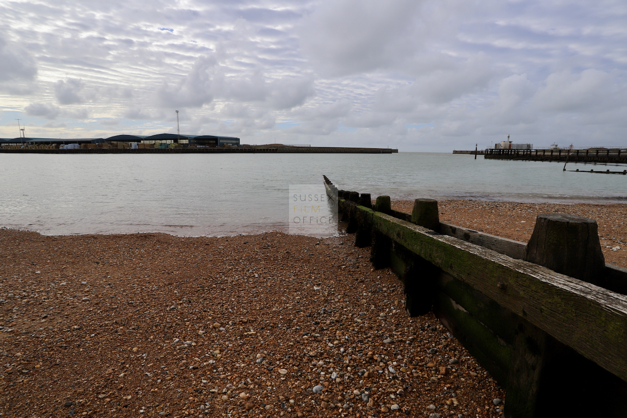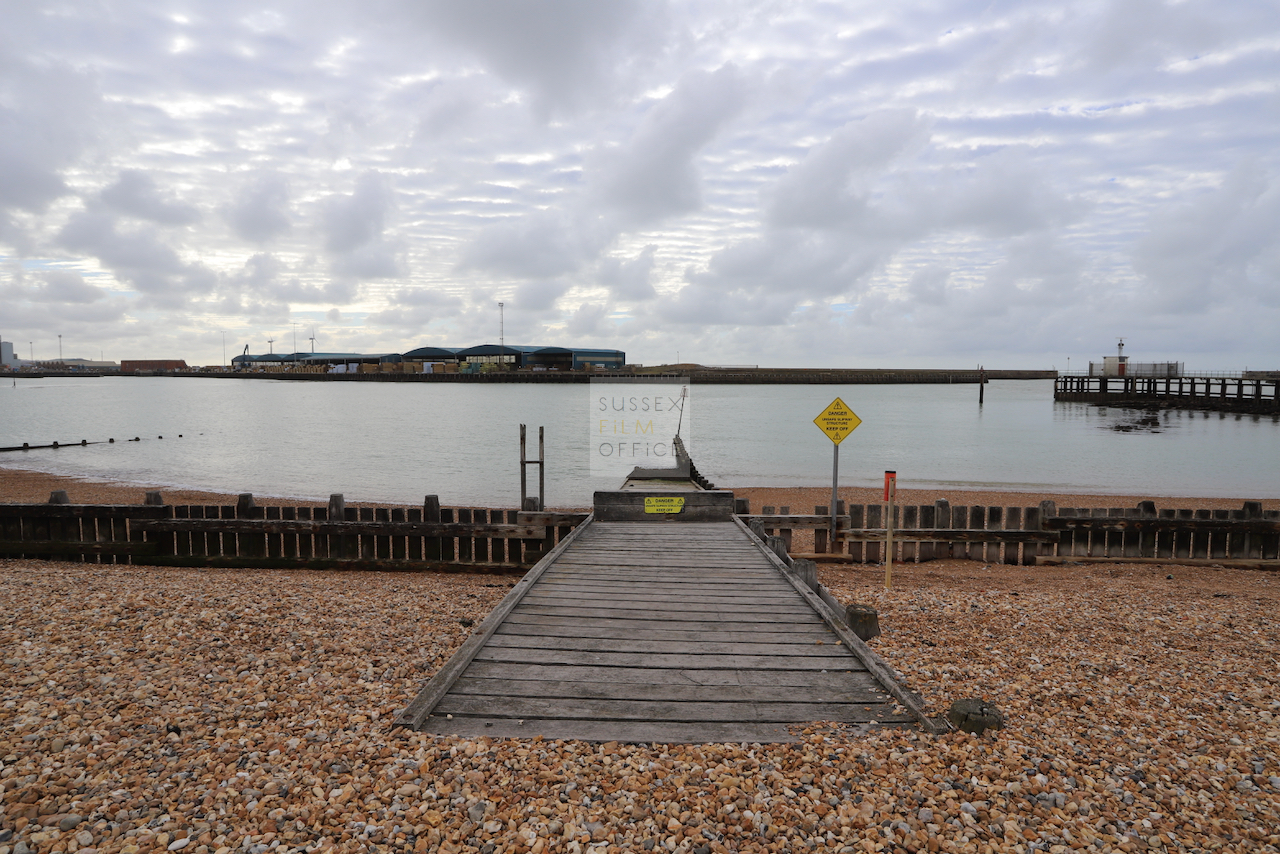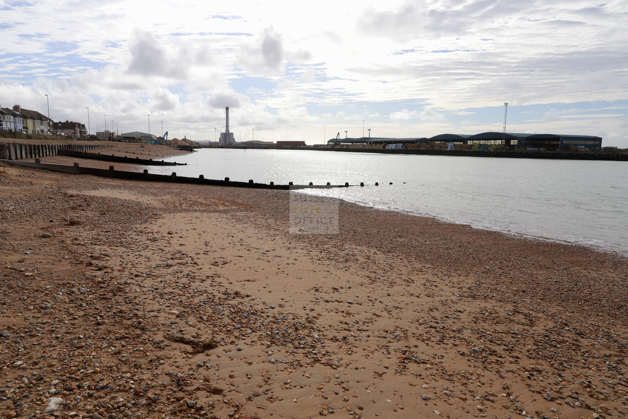 The beach lies within a harbour and is composed of shingle and gravel, with a number of wooden groynes sloping into the sea. At low tide a small area of wet sand and gravel is exposed. Behind the beach is a small area of sand, on which sits a working lighthouse originally built in the mid-19th century, and there is a lifeboat station is adjacent to the beach. The harbour is used by a mix of commercial and leisure vessels. At the entrance to the harbour, across from the beach are the remains of a Redoubt. An interesting location for filmmakers.