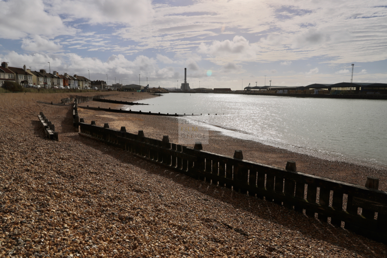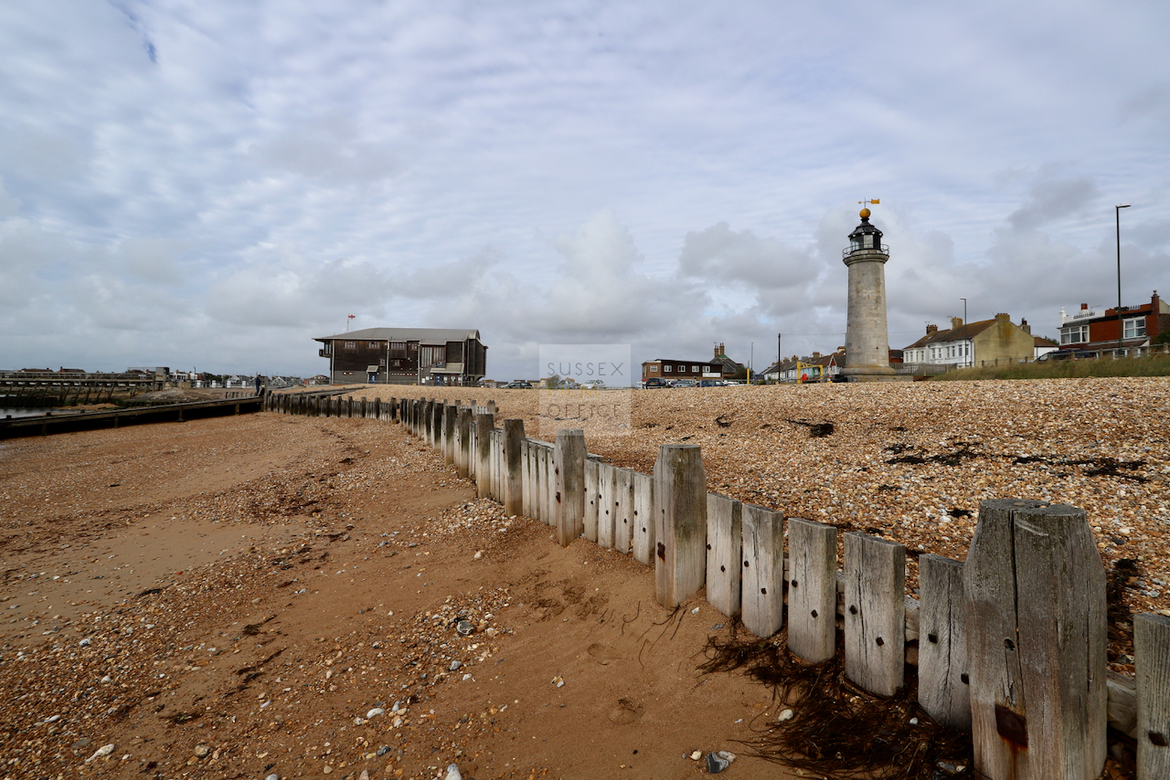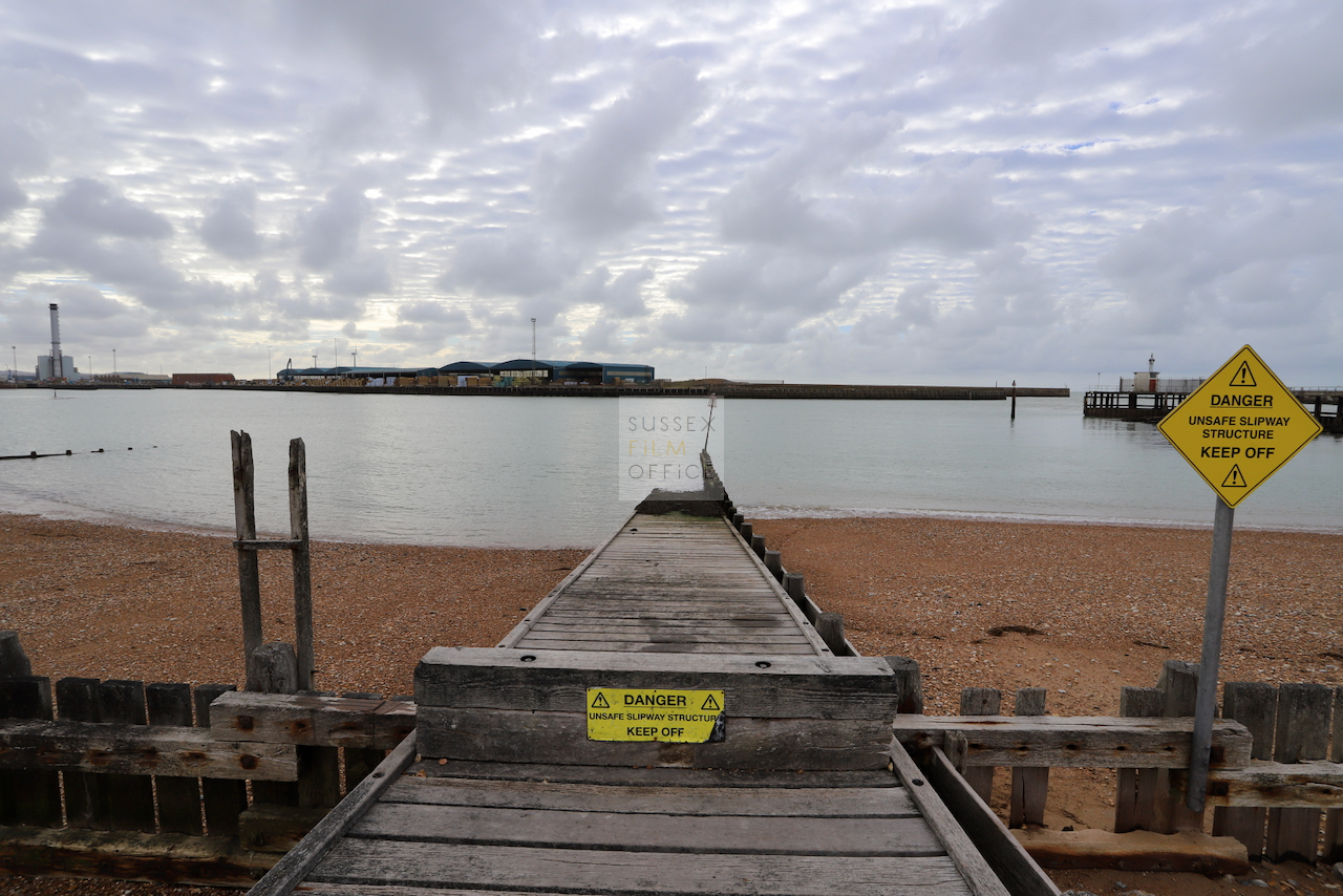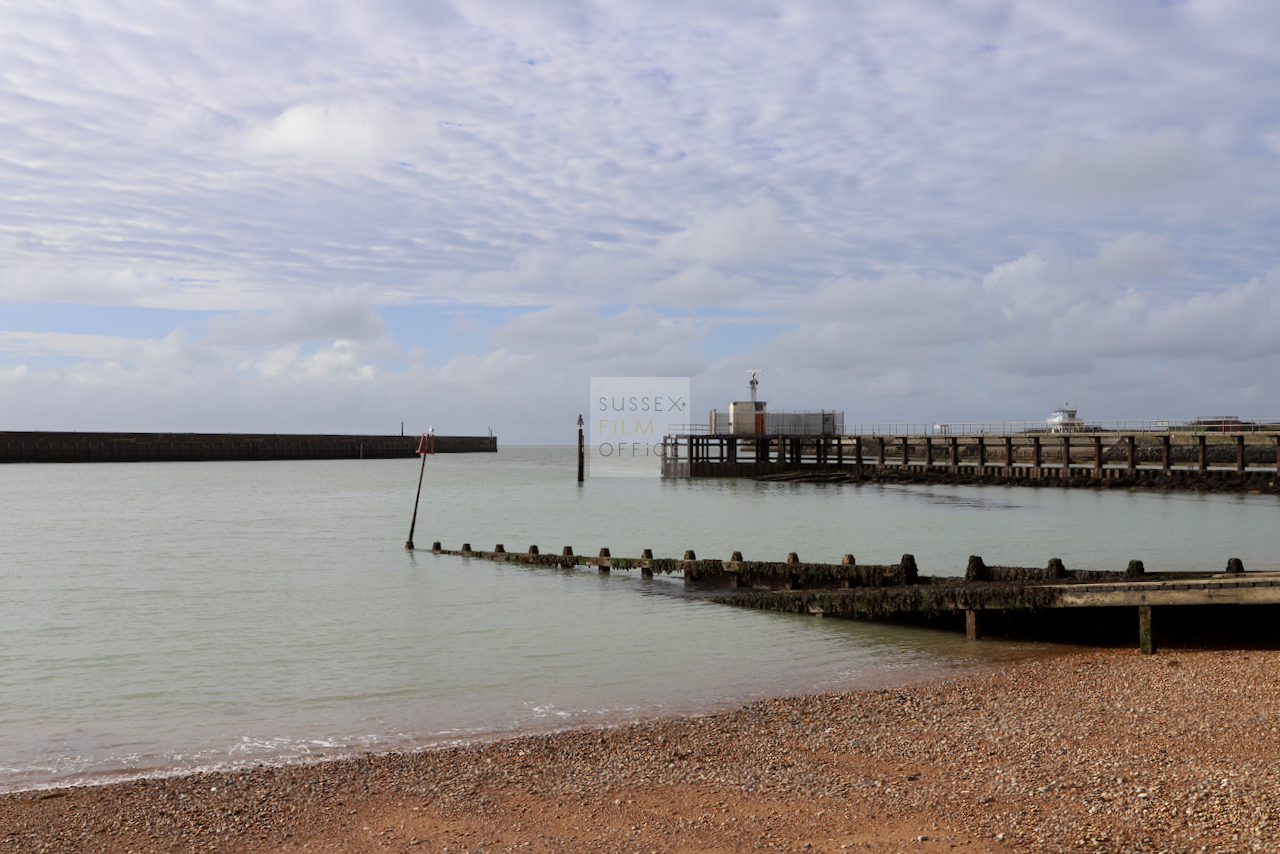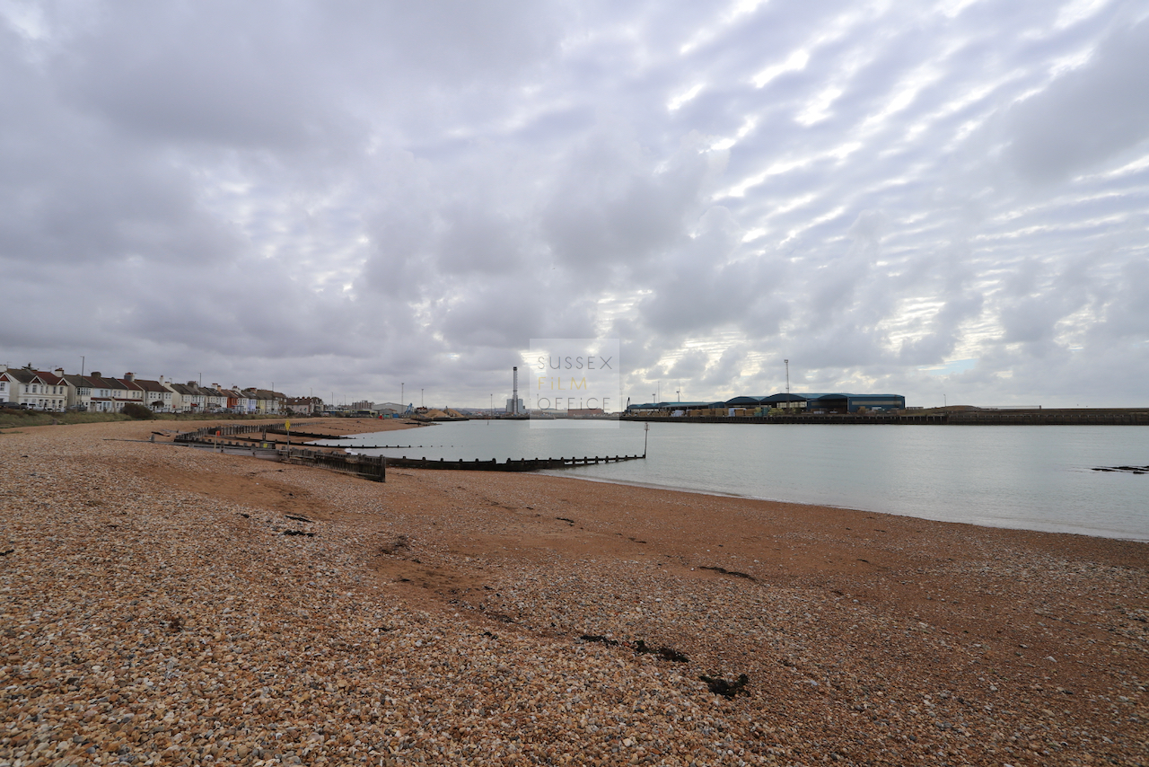 The beach lies within a harbour and is composed of shingle and gravel, with a number of wooden groynes sloping into the sea. At low tide a small area of wet sand and gravel is exposed. Behind the beach is a small area of sand, on which sits a working lighthouse originally built in the mid-19th century, and there is a lifeboat station is adjacent to the beach. The harbour is used by a mix of commercial and leisure vessels. At the entrance to the harbour, across from the beach are the remains of a Redoubt. An interesting location for filmmakers.
