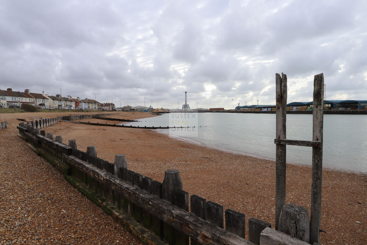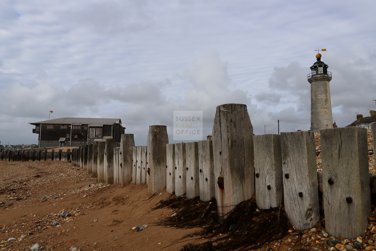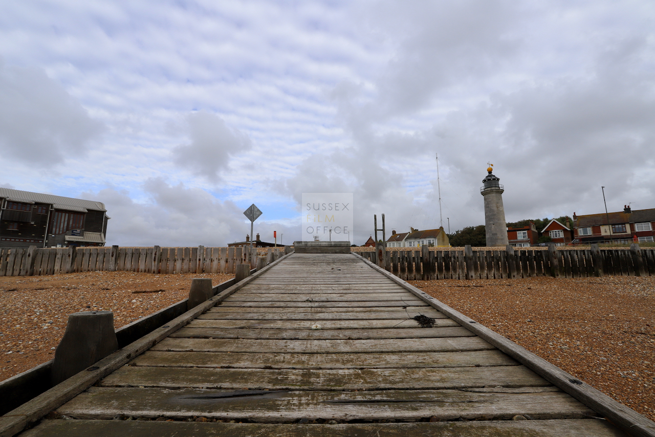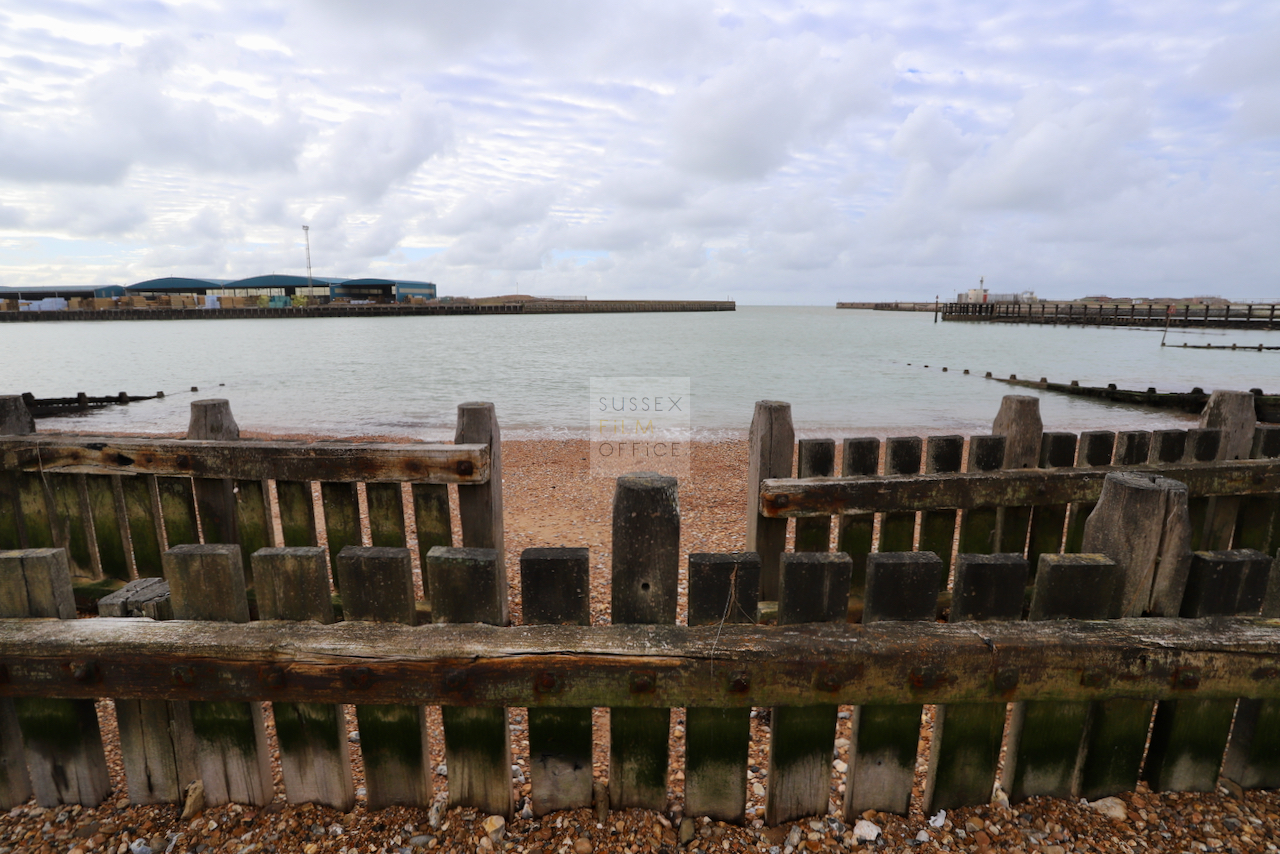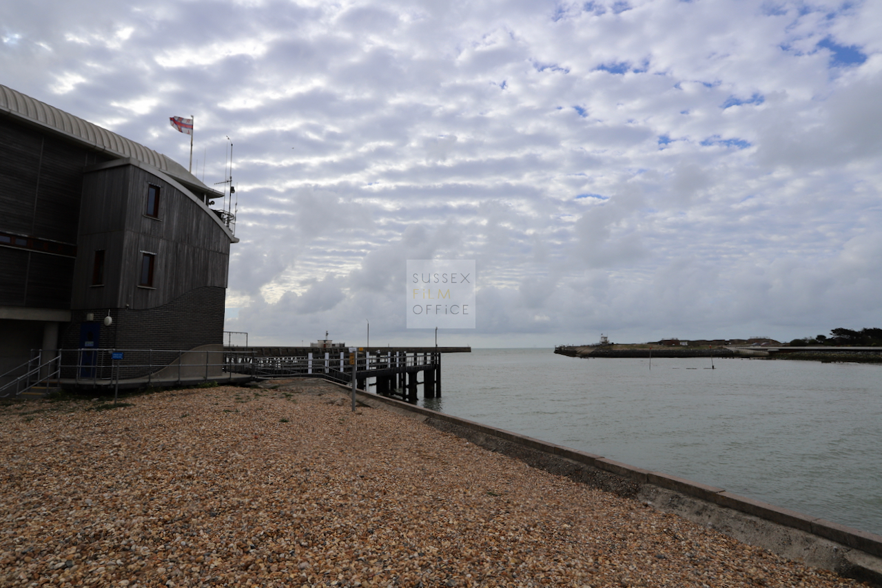The beach lies within a harbour and is composed of shingle and gravel, with a number of wooden groynes sloping into the sea. At low tide a small area of wet sand and gravel is exposed. Behind the beach is a small area of sand, on which sits a working lighthouse originally built in the mid-19th century, and there is a lifeboat station is adjacent to the beach. The harbour is used by a mix of commercial and leisure vessels. At the entrance to the harbour, across from the beach are the remains of a Redoubt. An interesting location for filmmakers.